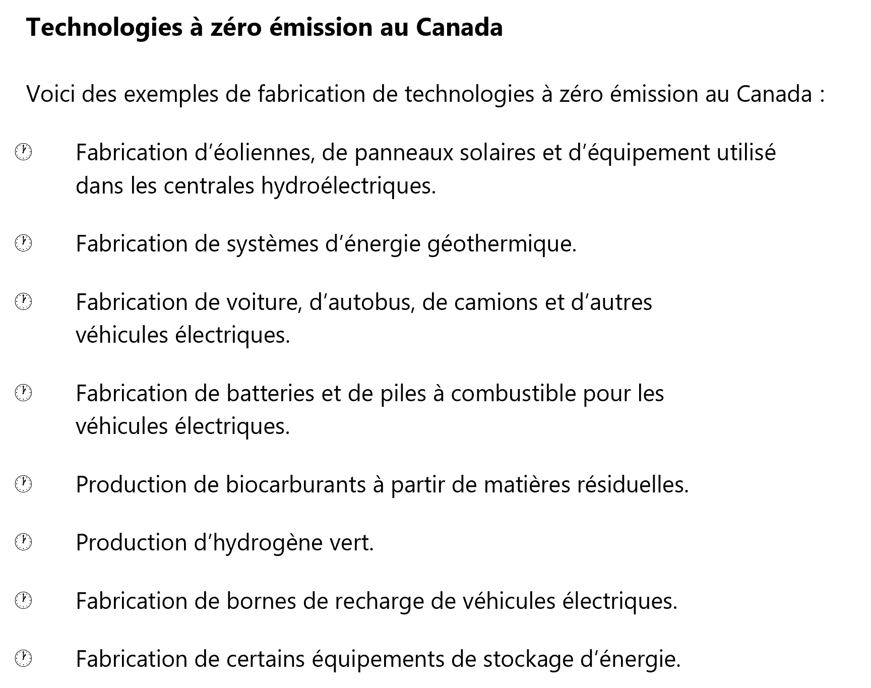 - Le budget de 2021 propose de réduire de 50 % les taux d’imposition générale des sociétés et des petites entreprises qui fabriquent des technologies à zéro émission. Les réductions entreraient en vigueur le 1er janvier 2022 et seraient progressivement éliminées à compter du 1er janvier 2029 pour l’être complètement le 1er janvier 2032.