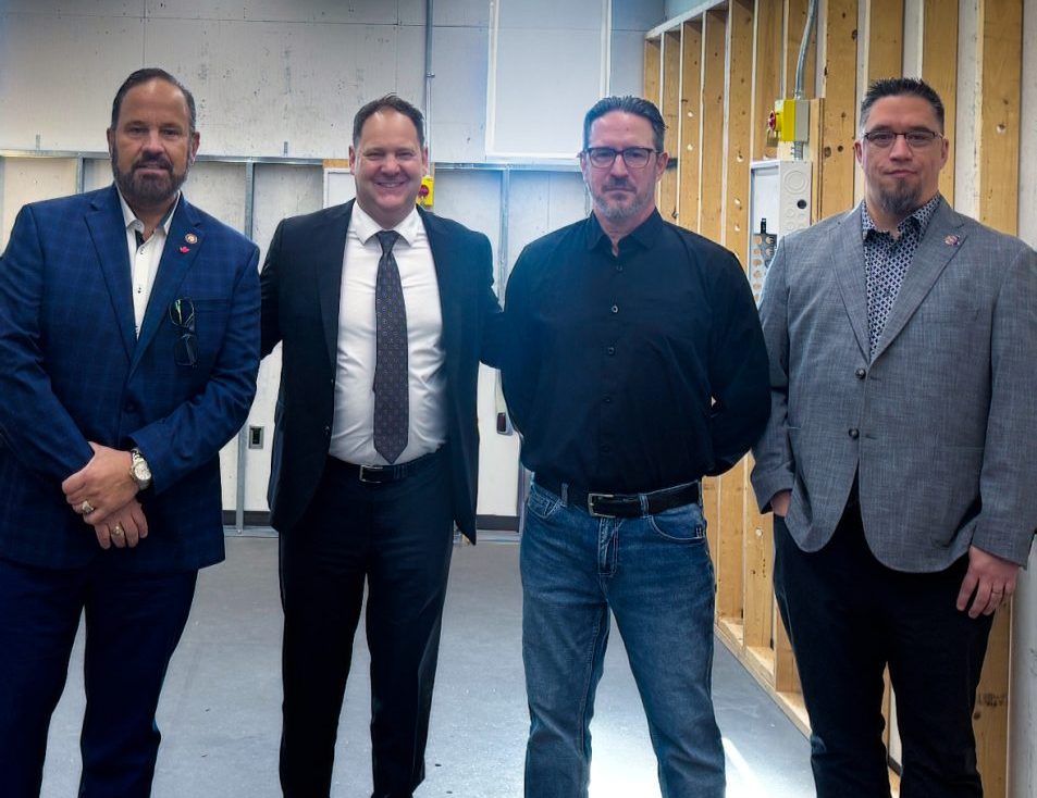 Le VPI Shewchuk et le secrétaire d’État John Zerucelli en compagnie de Warren Herntier et de Daemien Bernhard, de la section locale 2085, au centre de formation de la FIOE 2085.