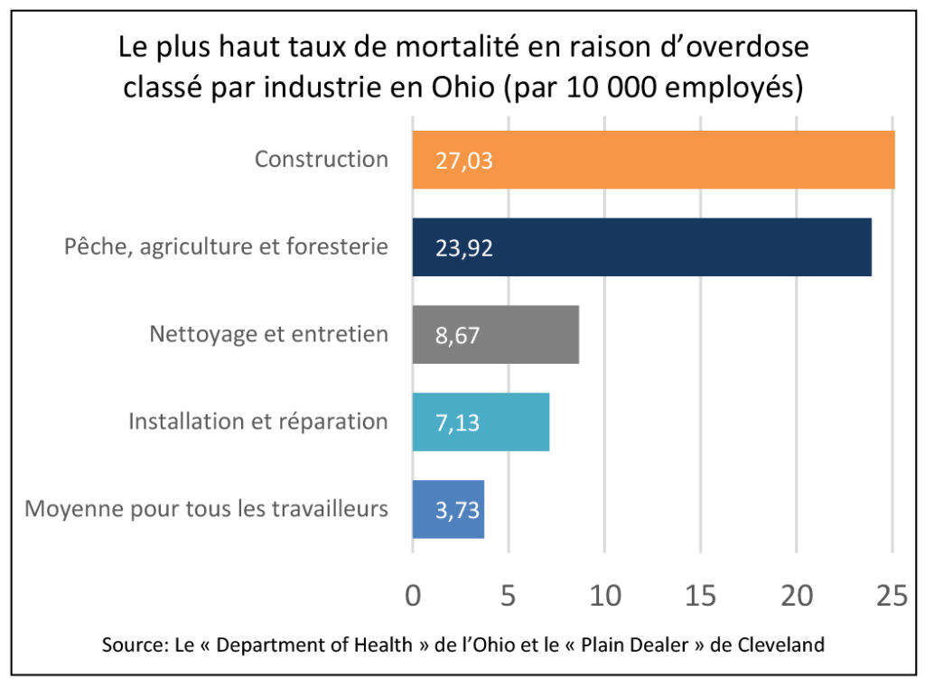 Selon une analyse menée par « Plain Dealer » à Cleveland, les travailleurs de la construction sont sept fois plus susceptibles de mourir d’une surdose à comparer à d’autres personnes à l’Ohio. En Colombie-Britannique, 55 % des morts causées par des surdoses dans la province étaient des travailleurs dans domaine de la construction et du transport, rapporte l’« Ottawa Citizen ».