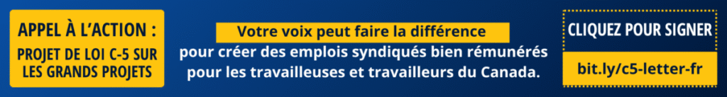 Cette campagne comprend une lettre adressée au premier ministre Mark Carney et à la ministre Patty Hajdu pour leur demander que le projet de loi C-5 suive l’exemple du projet de loi C-59 en matière de normes de travail solides.